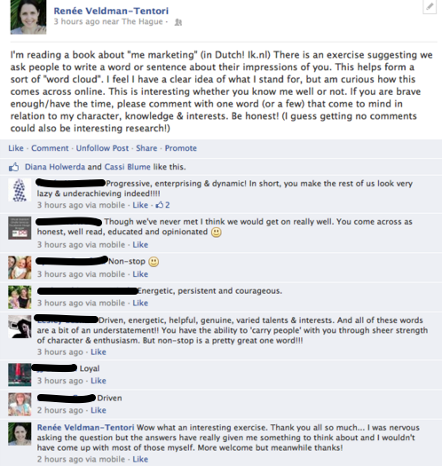 I’m reading a book about “me marketing” (in Dutch! Ik.nl) There is an exercise suggesting we ask people to write a word or sentence about their impressions of you. This helps form a sort of “word cloud”. I feel I have a clear idea of what I stand for, but am curious how this comes across online. This is interesting whether you know me well or not. If you are brave enough/have the time, please comment with one word (or a few) that come to mind in relation to my character, knowledge & interests. Be honest! (I guess getting no comments could also be interesting research!)