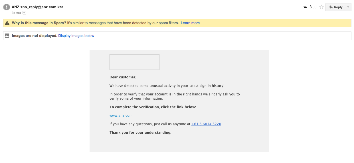 I was an ANZ (Australian & New Zealand Banking group) customer and have been since a child. Now living in the Netherlands, I actually shut this down before I relocated. I realised though, when scanning my emails, that having banked with ANZ for so long, this email got my attention. It was in my spam folder, but I check this regularly as my gmail filters can often be over-aggressive.
