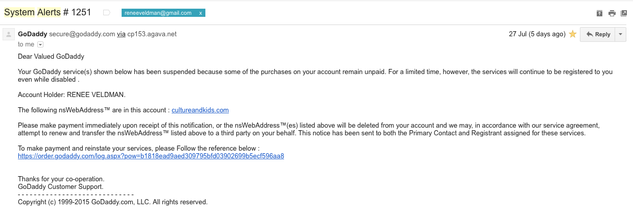 Why is it smart spamming? I recently transferred my domain name ownership for http://www.cultureandkids.com from Hostgator to GoDaddy. Therefore it was still fresh in my mind and I thought that something may have gone wrong with my payment. This email looks official and has all my details – however these are available on a public register for those who own domains.