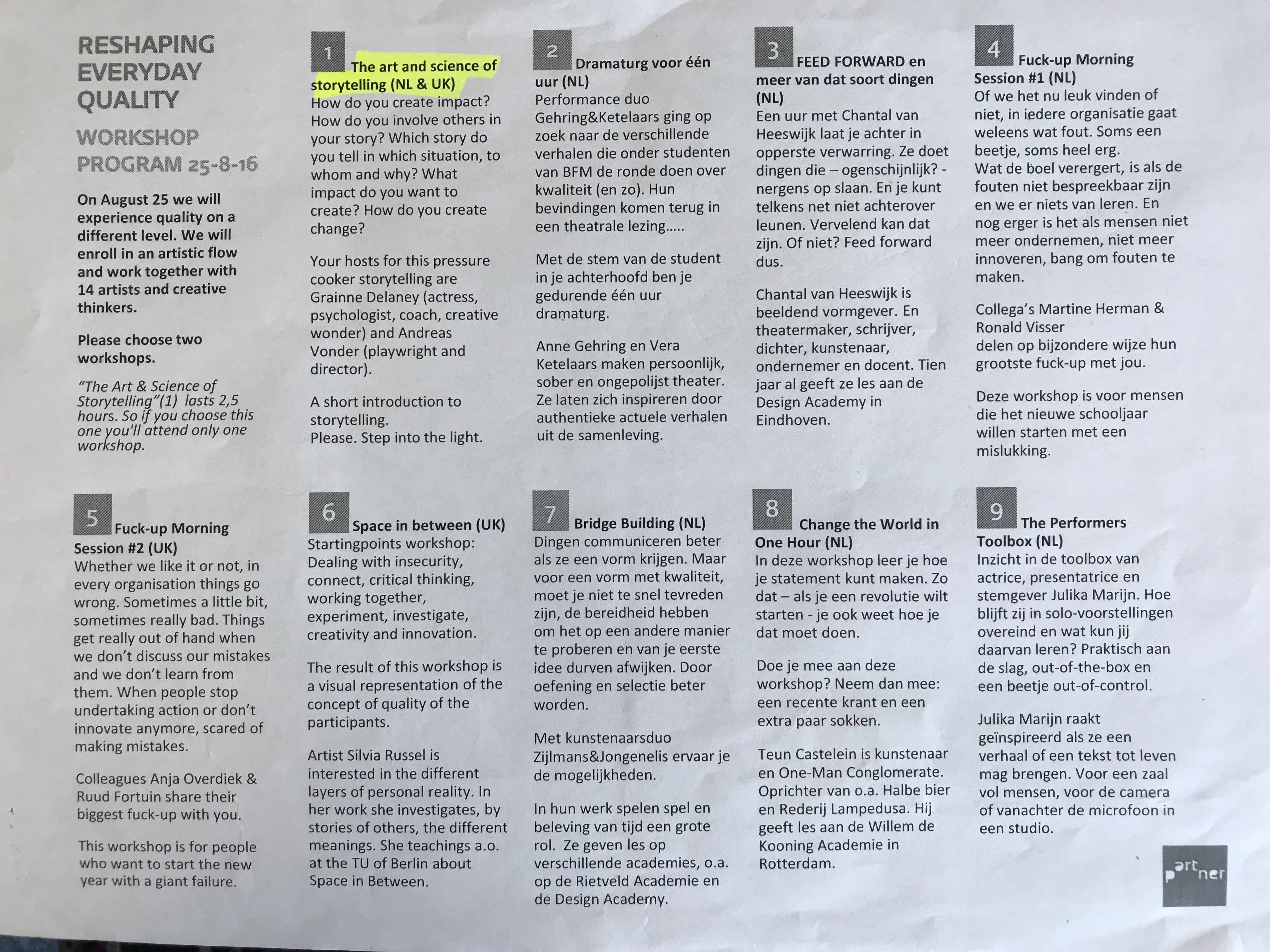 On 25 August 2016, I attended a staff day and workshops with The Hague University of Applied Sciences. There was a lot on offer form artists and creative thinkers. The goal was for us lecturers to “reshape everyday quality” and bring more creativity into our classes.