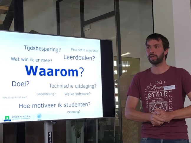 Harm Bartholomeus from Wageningen University spoke about the different questions and challenges lecturers have when implementing blended learning, such as why use it and how to motivate the students. He explained that for him, it’s essentially about saving time when dealing and making it simply a part of your course design and expecting that the students take part.