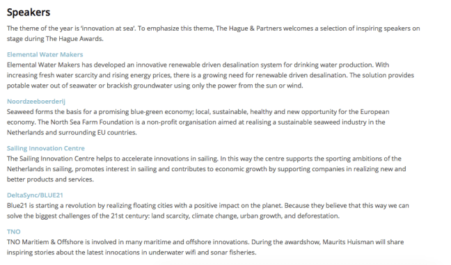 Thank you to the organisers for a wonderful event, including Marco Esser (Director of The Hague Marketing Bureau), Nienke van der Malen – van der Horst (Director, The Hague Convention Bureau) and Ilja van Haaren (Director, The Hague Business Agency). Congratulations to all nominees and winners for their contributions to this city that I now call home.
