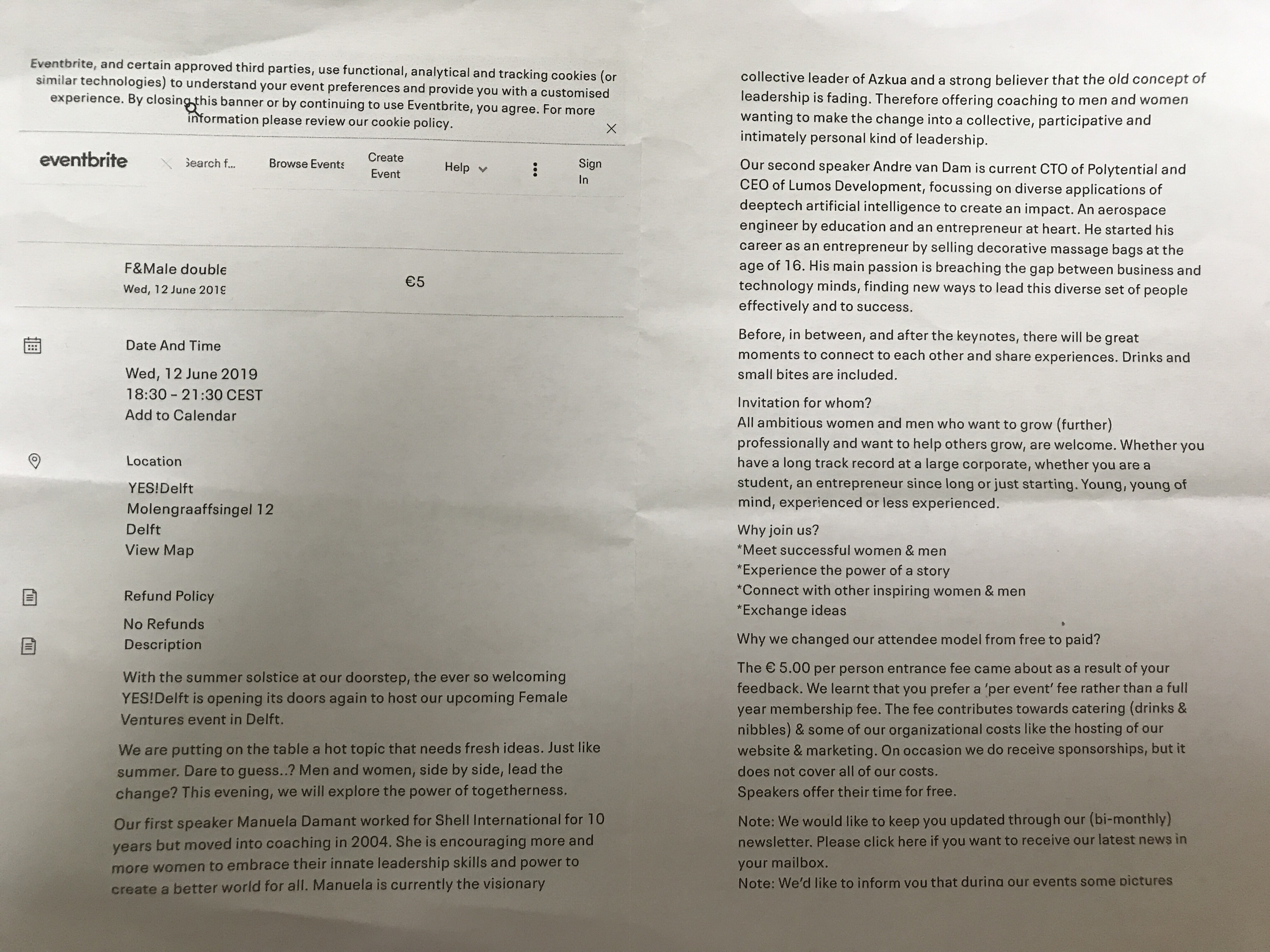 The topic of the evening was F&Male: Double Potential, about men and women side by side, leading change at work: https://femaleventures.nl/event/fmale-double-potential-female-ventures-delft/
