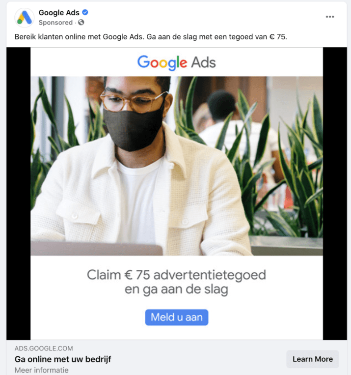 This Dutch advertisement to “Claim 75 euros of advertising credit to get started” encourages businesses to reach clients online with Google Ads. Certainly something useful during the digitisation many have been forced to adapt this year. Not a bad thing – however an interesting choice of image. Facemasks have of course become the norm this year but I’m wondering what it has to do specifically with this ad? A facemask isn’t necessary to advertise online right?