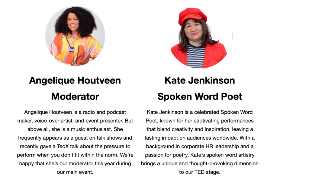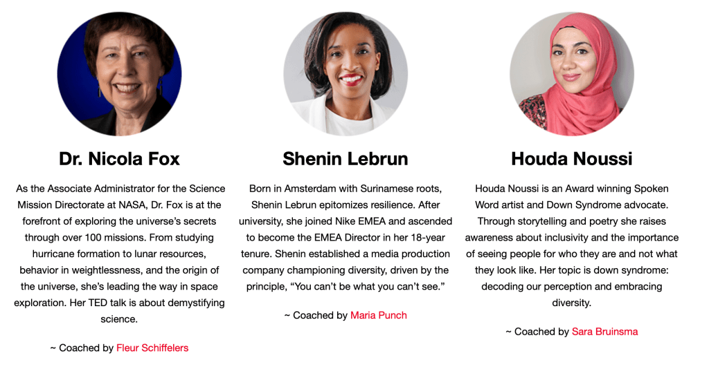 On Wednesday 29 December 2023, I attended the TEDx Amsterdam Women event. Below are screenshots of the TEDx Amsterdam Women website for their 2023 speakers….please visit their website (link below) for more information.