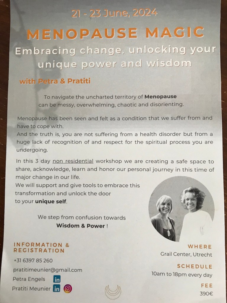One final short presentation was fabulous, about an upcoming workshop….the timing doesn’t suit me right now, but what a wonderful way to learn more about menopause…details in the flyer below.