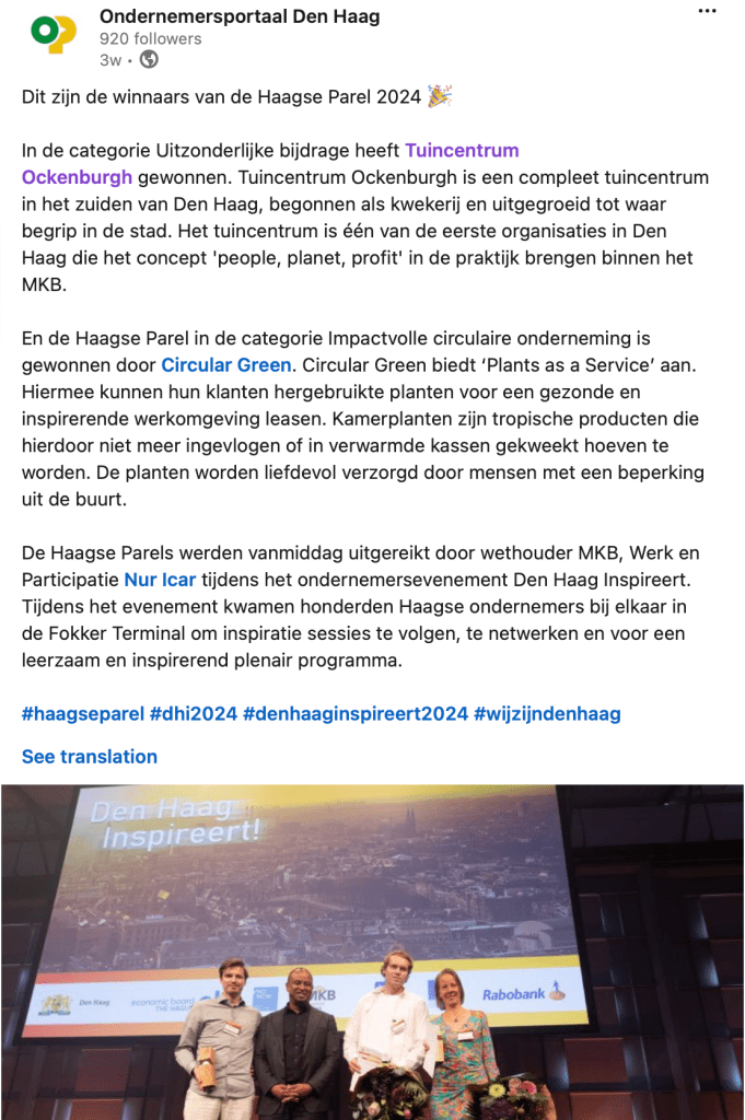 A huge congratulations to alumnus Juriën Kester for successfully taking the prize last week at The Hague Pearl awards for his family business Tuincentrum Ockenburgh. It was complimented on being one of the first organisations in The Hague to truly encompass the “people, planet and profit” concept.