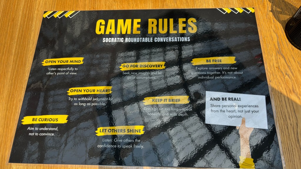 I wasn’t able to stay for this, but on the way out saw some in depth conversations going on, inspired by artworks placed next to each table and guided by these cards.