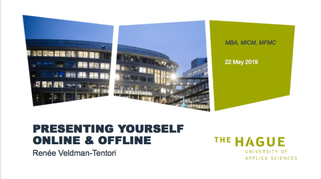 On Wednesday 22 May, I gave an evening workshop to Masters students of the MBA, MICM and MFMC programmes at The Hague University of Applied Sciences. This workshop will offer some insights on how to best present yourself. Not only during a face-to-face presentation or interview but also online. One of the ways to professionally … Continue reading Presenting yourself online and offline